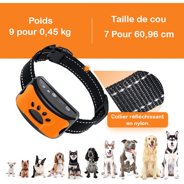 The device automatically reduces the dog's barking through the emission of sounds and vibrations. Audible beeps and vibrations are activated automatically based on the intensity of the dog's barking and increase after each bark.